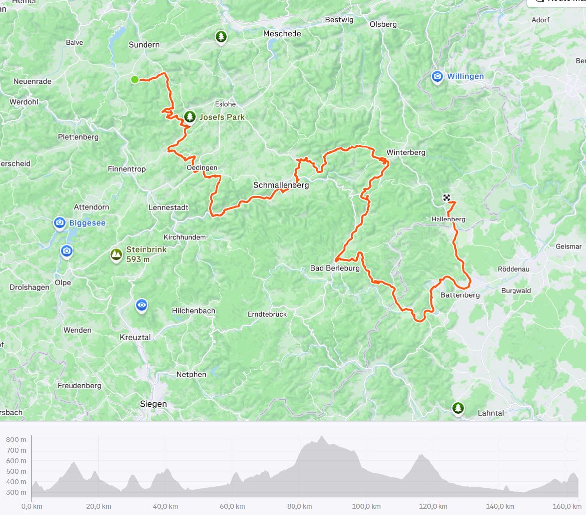Ik ben het hoogste punt gepasseerd, 835 meter hoog. Nog een paar klimbeurten vandaag. Hopelijk haal ik Medebach.
