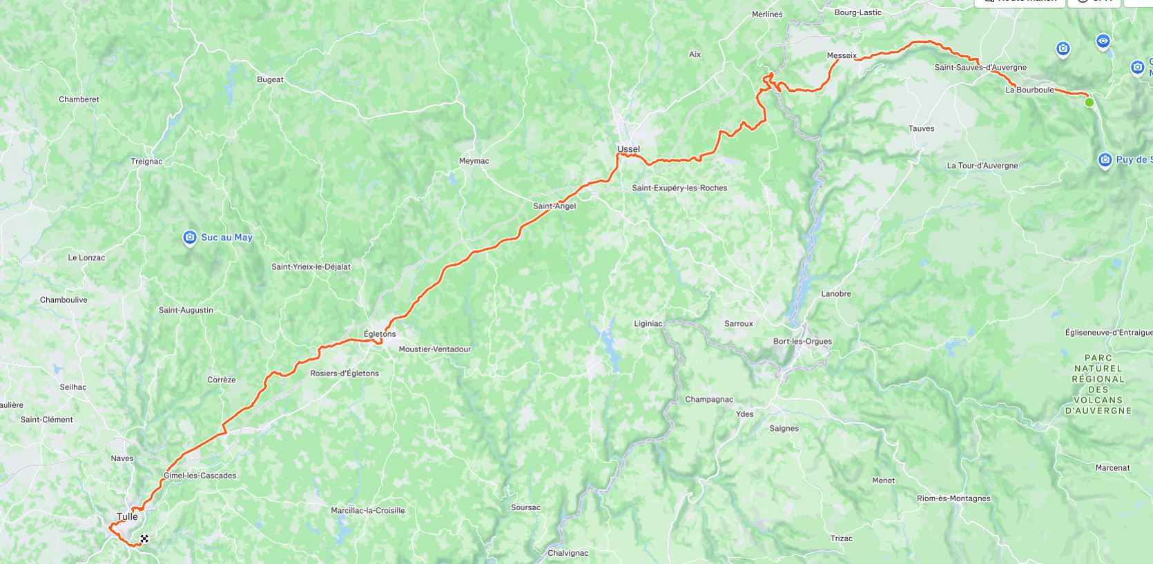 Op een gegeven moment de doorlopende D wegen gevonden richting Tulle, maar OMG. wat rijden die Fransen soms hard. Gelukkig waren het er niet veel, want zondag en feestdag.